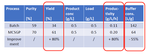 ??? 有案例證明,MCSGP可將產品純度從傳統工藝的59%提升至70%,將收率從傳統工藝的34%提升至61%,從而使產量(g /L /h)整體提升80%,并同時使Buffer的消耗量降低55%MCSGP工藝,無疑可顯著地節約成本投入,并可產生更多的生產效益。