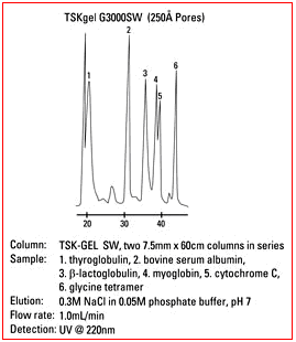 SW型柱以高多孔性硅膠顆粒為基礎,其表面因受二醇功能基配體的衍生作用保護而不與蛋白質相互作用。TSKgel SW型柱憑借其大孔隙容積而勝過其它硅膠基質或聚合物高性能尺寸排阻柱。