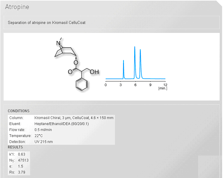 ? 纖維素衍生物手性固定相CelluCoat,以Kromasil高純硅膠為基質,表面涂敷有纖維素-三(3,5- 二甲苯基氨基甲酸酯)。 Kromasil CelluCoat的手性固定相和Daicel CHIRALPAK OD/OD-H 的固定相完全相同,而CelluCoat采用的高純硅膠和全新鍵合技術,使其在分離度、選擇性、耐受壓力和柱壽命方面表現出完美的性能。Kromasil CelluCoat是應用范圍最廣的手性固定相,許多化合物都能達到基線分離。