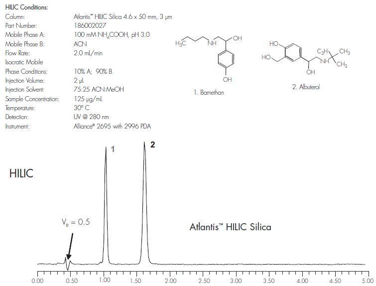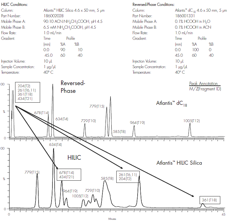 HILIC是不用于反相的色譜技術(shù),提供了相對(duì)于反相的互補(bǔ)的選擇性,通常能保留傳統(tǒng)方法所無法保留的高極性化合物。Atlantis HILIC硅膠色譜柱設(shè)計(jì)用于保留因極性過高而無法用反相保留的高極性有機(jī)分子。與反相分離使用高比例水相用于保留極性分子不同,Atlantis HILIC硅膠柱使用高揮發(fā)性的流動(dòng)相(>80%有機(jī)相),這對(duì)于質(zhì)譜響應(yīng)與檢測(cè)靈敏度非常理想。此外,HILIC色譜技術(shù)直接兼容于SPE高有機(jī)相洗脫物,這大大提高了可處理的樣品數(shù)量,從而在實(shí)質(zhì)上提高了樣品通量。