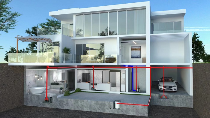一般來說,開發商在別墅地下室都是有坑位預留的,可以直接作為設備坑來使用,也就不用擔心設備放置位置的問題。在設計階段,就可以將設備坑位置與各個用水點位置一起來綜合考量,盡量減少后續的安裝布管的麻煩。