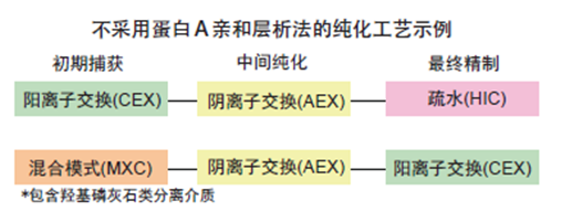 ??? 不采用蛋白A親和層析法的純化工藝可降低工藝成本。可通過結(jié)合使用陽離子交換層析法 ( CEX ) 、陰離子交換 層析法 ( AEX )、疏水相互作用層析法 ( HIC ) 以及混合模式層析法 ( MXC ) 實(shí)現(xiàn)對單抗的高純度純化制備。