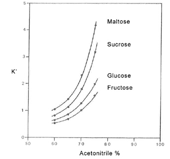 糖類的分離通常用到的是乙腈/水做流動相。當乙腈的含量增加,保留因子k’增加。但是乙腈的含量需要仔細的控制,因為隨著乙腈含量的增加,樣品的溶解性會變差。