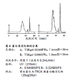 圖4所示為分離基因重組ProteinA的TRCK-胰蛋白酶消化物的實例。樣品中含有與蛋白質(zhì)消化物分子量不同的各類多肽。如上所示,由于TSKgel G2000SWXL色譜柱的分離范圍較寬,其分離效果也更好。(該樣品通過RPC分析的結(jié)果,可觀察到約有60種多肽峰在RPC下被檢測到)。