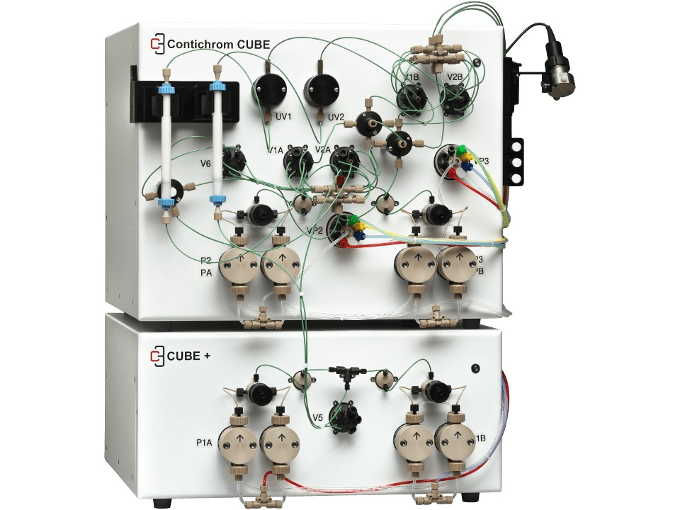 Contichrom層析系統,已由2004年的6-8柱位設計、2006年的3柱位設計,發展為最優化的2柱位設計,可運行多種層析模式,如標準批處理過程、MCSGP(多柱逆流溶劑梯度純化)、N-Rich等,實現了層析新技術與層析系統軟硬件設計的完美結合,使得設備成本更低,構造更為簡化,并可使層析填料、緩沖液等成本投入大為節省,同時也使得純化周期大為縮短。