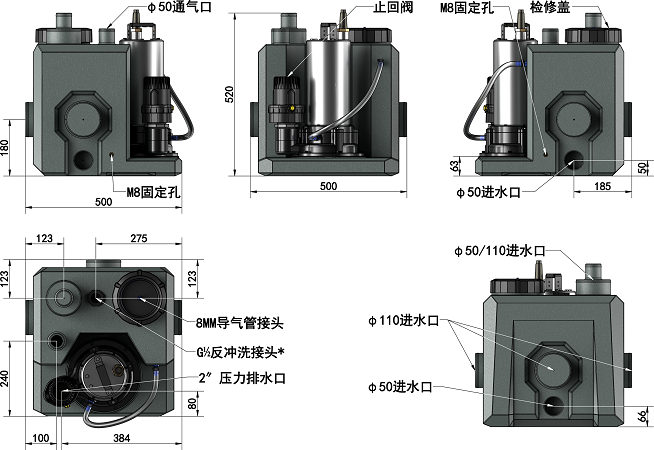 · 入水口:3×φ110,3×φ50,1×φ50/110